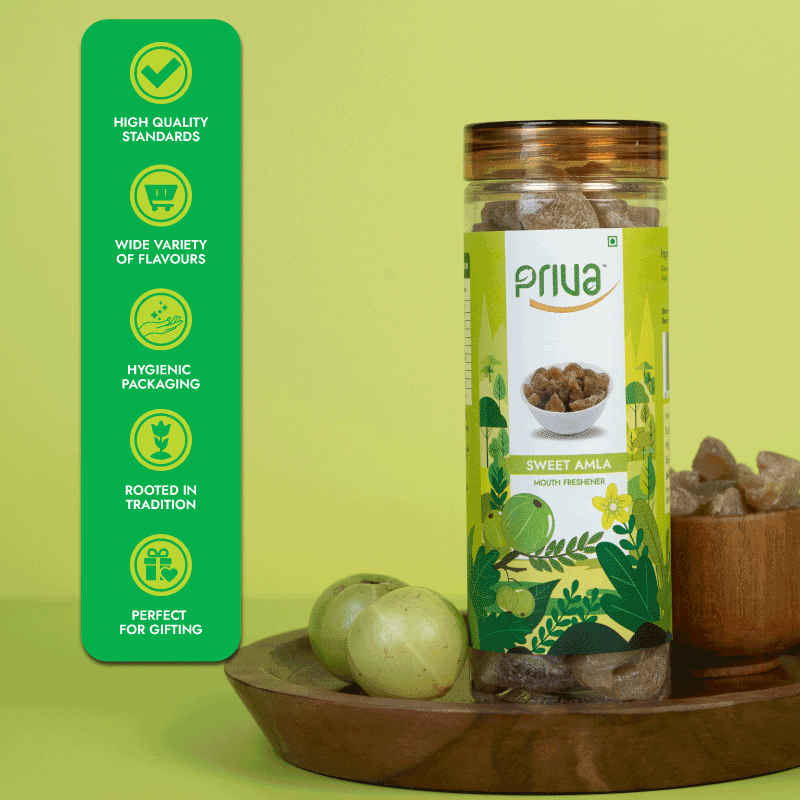 Indulge in Priva’s Sweet Amla — luscious Indian gooseberries sweetened just right with sugar and a hint of tangy citric acid. This classic treat combines delightful flavor with a burst of vitamin C and antioxidants for a refreshing, nourishing experience.