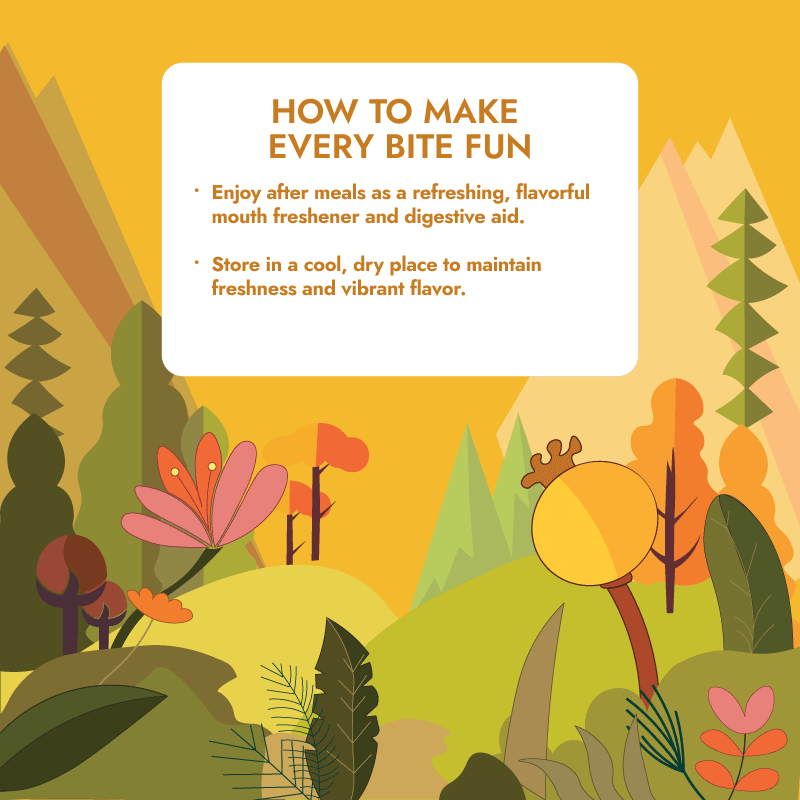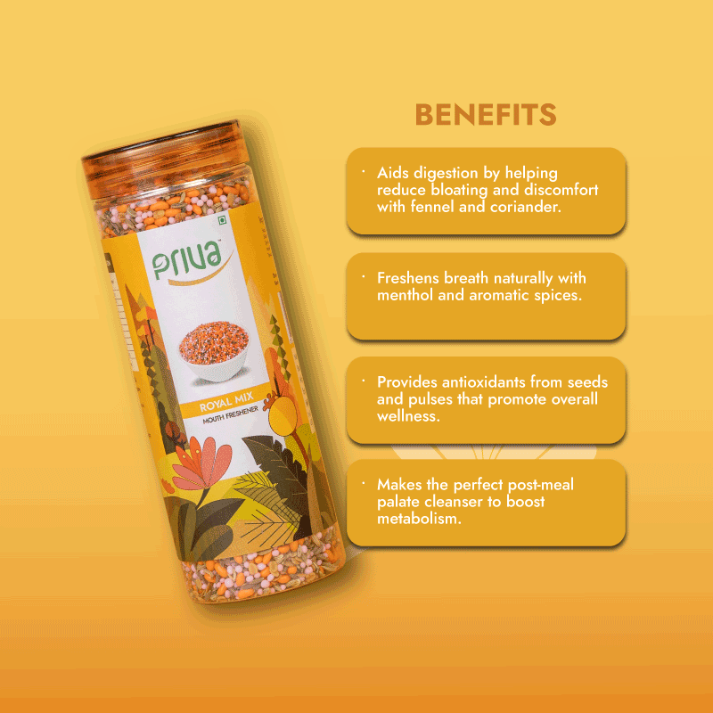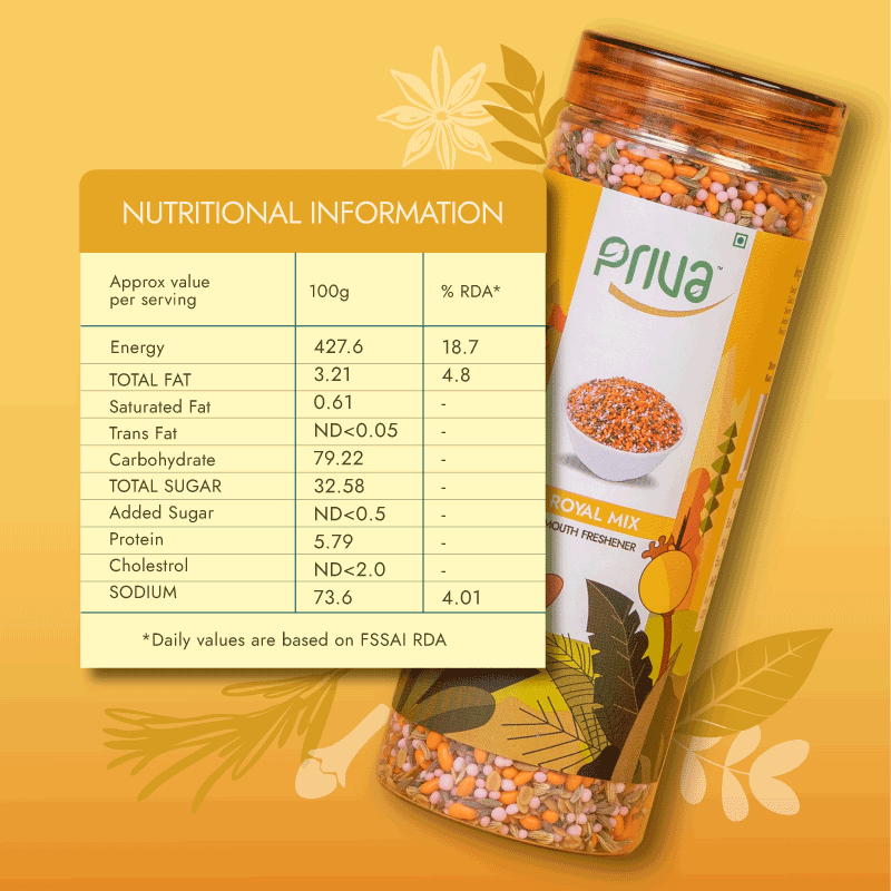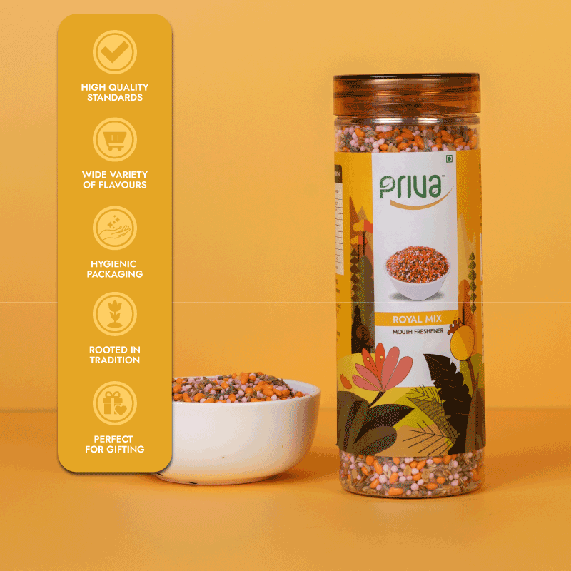 Experience the exquisite taste of Priva’s Royal Mix — a delightful blend of sugar, fennel, coriander split pulse, and cooling menthol, enhanced with natural and artificial flavors and vibrant synthetic colors. This royal mix refreshes breath and supports digestion with every satisfying bite.