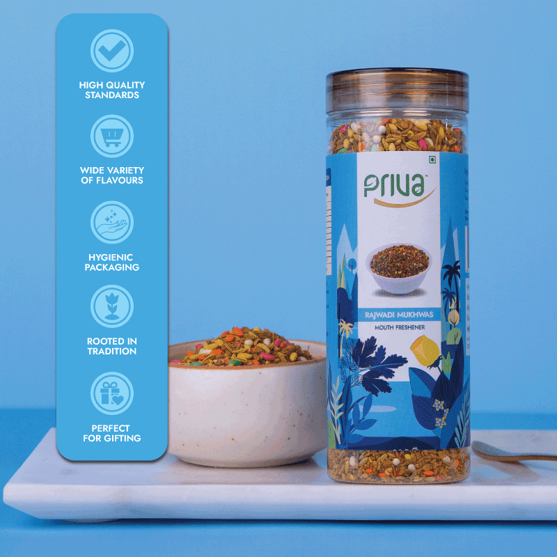 Experience the royal blend of Priva’s Rajwadi Mukhwas — a delightful mix of sugar-coated fennel seeds, Dhanadal, fennel seeds, and sesame seeds. This traditional Indian mouth freshener not only cleanses the palate but also aids digestion with every refreshing bite.