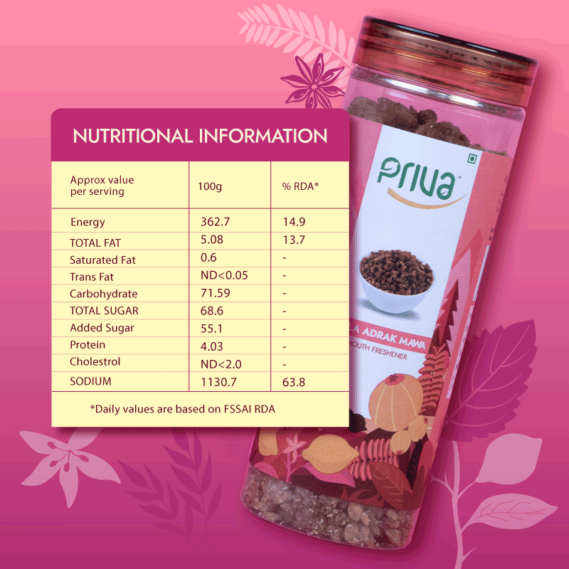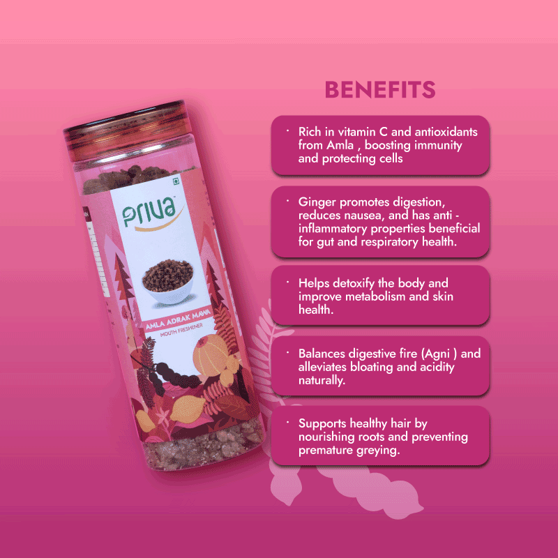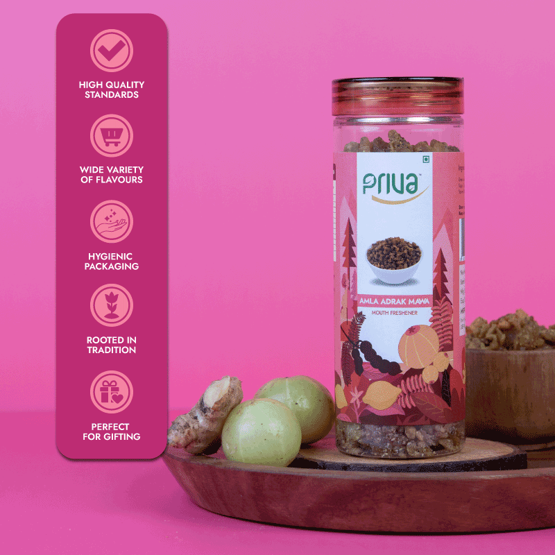 Priva’s Amla Adrak Mawa combines the natural goodness of Green Amla Fruit (Indian Gooseberry), ginger, sugar, iodized salt, black salt, spices and condiments, and citric acid (INS-330). This unique blend supports immunity, digestion, and overall vitality with a refreshing, tangy flavor.