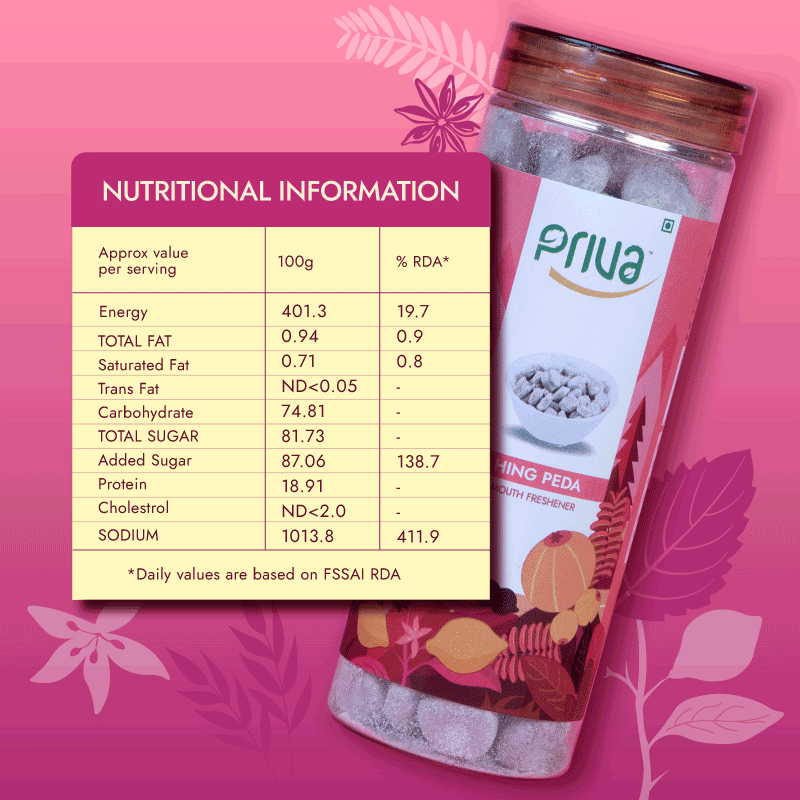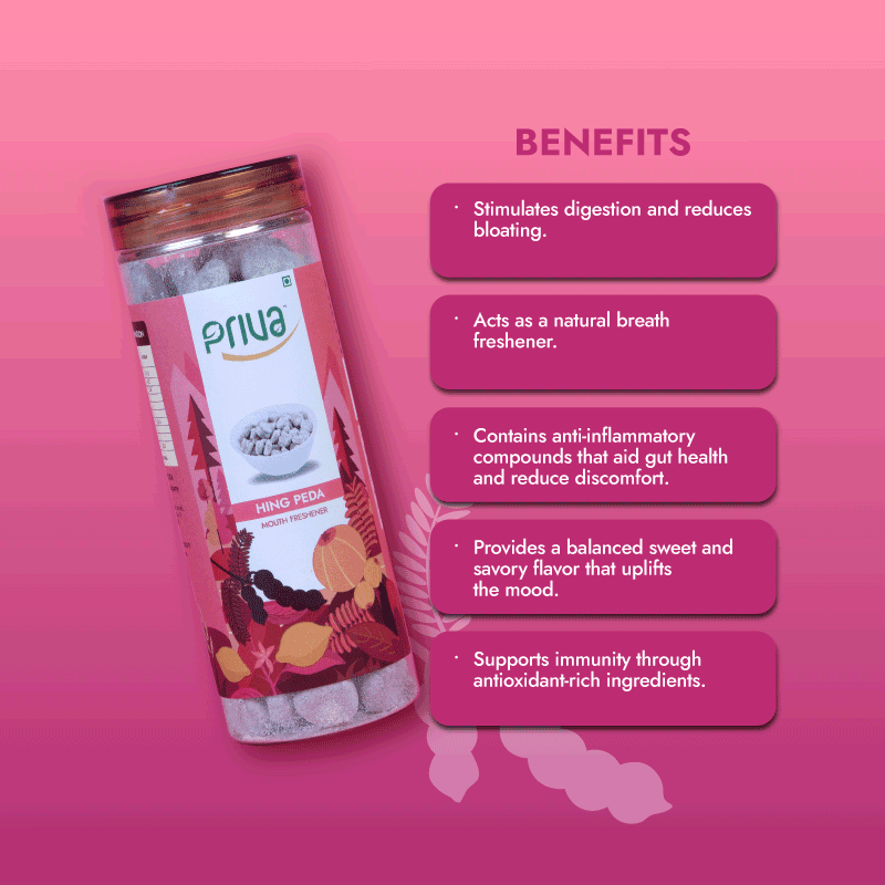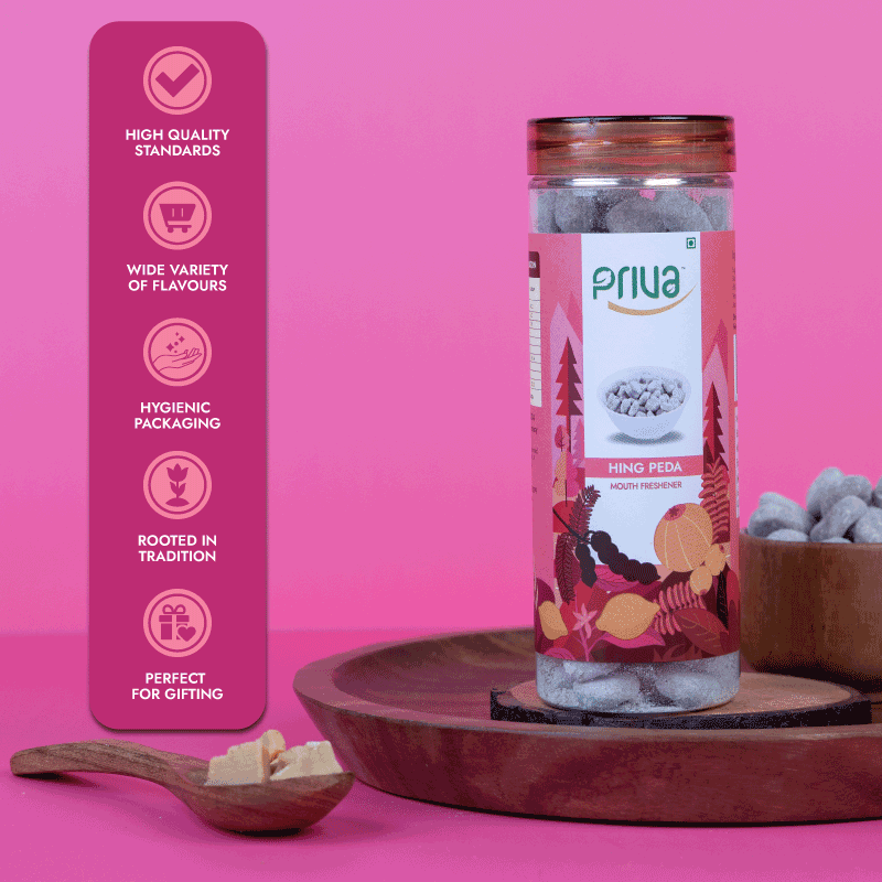 Priva’s Hing Peda is a unique traditional sweet crafted with sugar, dry mango powder, iodized salt, black salt, red pepper, citric acid (INS-330), black pepper, Peepal, pomegranate seed, cumin seed, and asafoetida (hing). This flavorful treat supports digestion and refreshes the palate after meals.