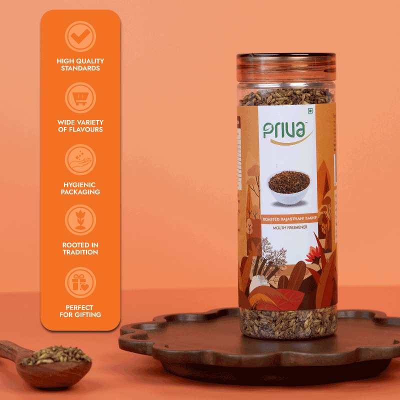 Priva’s Roasted Rajasthani Saunf features premium roasted fennel seeds (saunf) blended with lico-rice, sweeteners, and natural and artificial flavours including rose. This unique blend contains saccharin sodium and no added sugar, providing a refreshing, aromatic, and digestive mouth freshener.